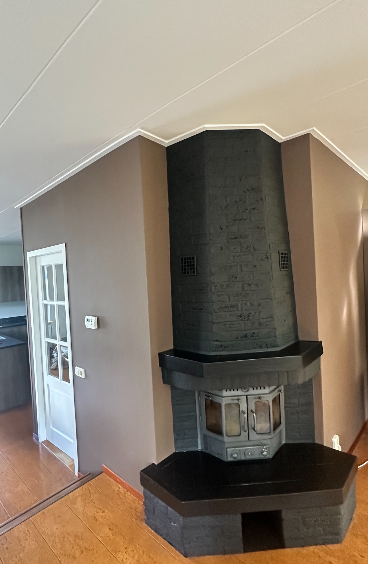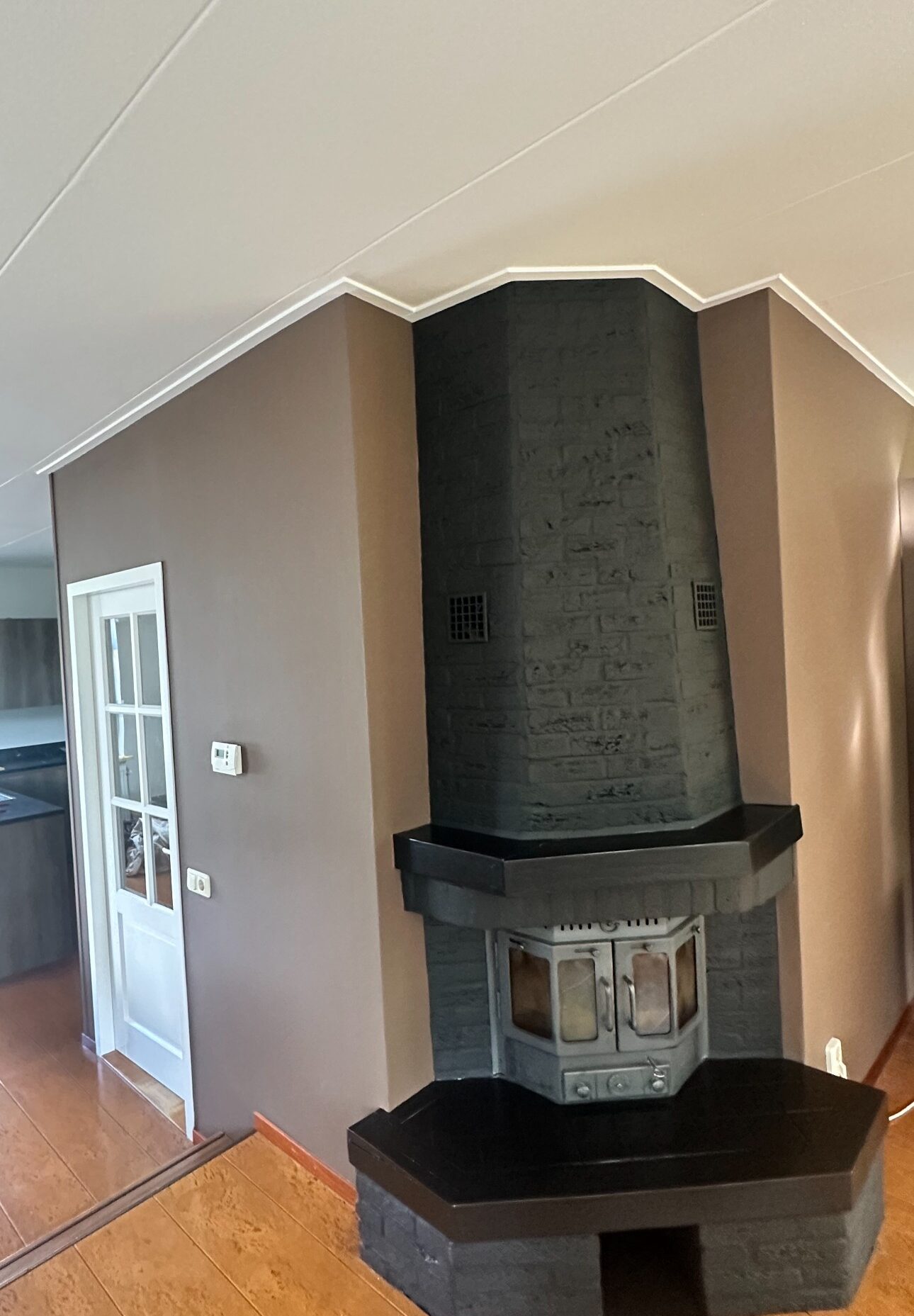 In deze karakteristieke boerderij in Woubrugge verzorgden wij het complete binnenschilderwerk in de woonkamer en gang. De wanden zijn strak afgewerkt in RAL 9016 voor een frisse basis. Rond de open haard kozen we voor twee Little Greene tinten: de bakstenen haard in Jack Black 119 en de aangrenzende muur in Scullery 318. Kozijnen en deuren werkten we duurzaam af met SIGMA S2U Nova Semi-Gloss in RAL 9016.
